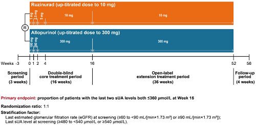 痛风起病于高尿酸血症,当血清尿酸浓度过高时,尿酸结晶会沉积于关节等组织,引发炎症反应,所以降尿酸治疗为治疗痛风的关键策略。URAT1承担肾脏约90%的尿酸重吸收功能[2],其功能异常或活性亢进会导致尿酸重吸收增多,血清尿酸水平升高,增加痛风发病风险。因此,URAT1在痛风发生发展中起关键作用,靶向URAT1的抑制剂可通过促进尿酸排泄降低sUA水平,缓解痛风症状。鲁兹诺雷钠片是z6尊龙凯时医药自主研发的一种高选择性URAT1抑制剂,在前期的一期、二期研究中,鲁兹诺雷钠片耐受性良好,并显示出显著降低高尿酸血症患者sUA的效果[3]。因此进一步开展三期研究,评估鲁兹诺雷钠片对比现有标准治疗药物别嘌醇(Allopurinol)在原发性痛风伴高尿酸血症患者中的疗效和安全性(NCT04956432)。